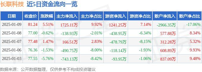 证券之星消息,截至2025年1月9日收盘,长联科技(301618)报收于81.24元,上涨5.51%,换手率13.34%,成交量2.15万手,成交额1.74亿元。