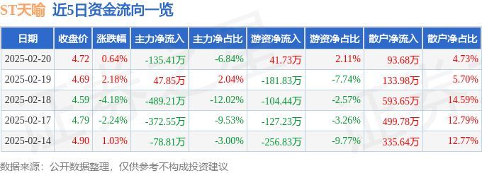 证券之星消息,截至2025年2月20日收盘,ST天喻(300205)报收于4.72元,上涨0.64%,换手率0.99%,成交量4.22万手,成交额1980.61万元。