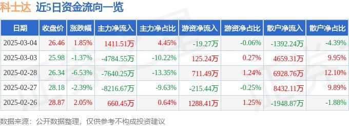股票行情快报:科士达(002518)3月4日主力资金净买入1411.51万元