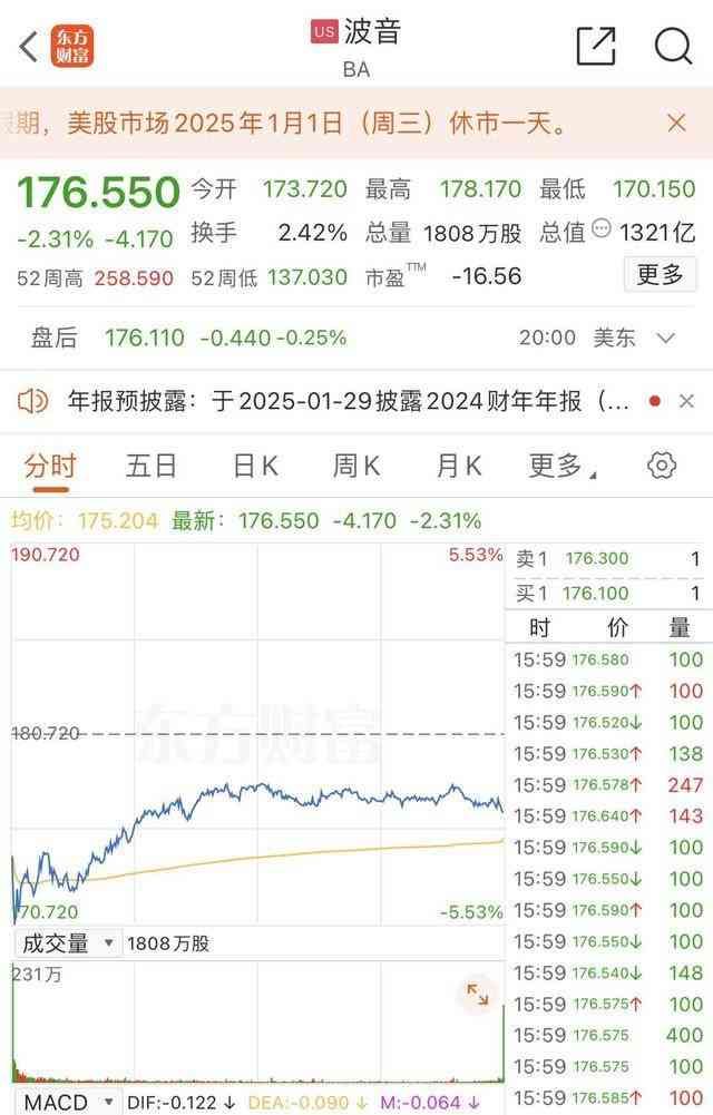 当地时间周一开盘,资本市场快速对这一起事故做出了反应——波音公司股价当天开盘便大幅下挫,盘中一度跌超5%。但盘中至尾盘有所反弹,最终下跌超过2%。