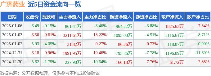 股票行情快报:广济药业(000952)1月6日主力资金净卖出861.41万元