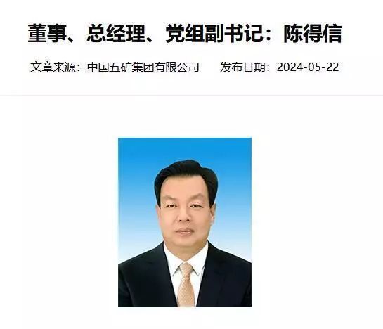 中新经纬5月22日电 据中国五矿集团有限公司(下称“中国五矿”)官网消息,5月22日,中国五矿召开领导班子(扩大)会议。受中央组织部领导委托,中央组织部有关干部局负责同志宣布了党中央关于中国五矿总经理任职的决定:陈得信任中国五矿董事、总经理、党组副书记。相关职务任免,按有关法律和章程的规定办理。