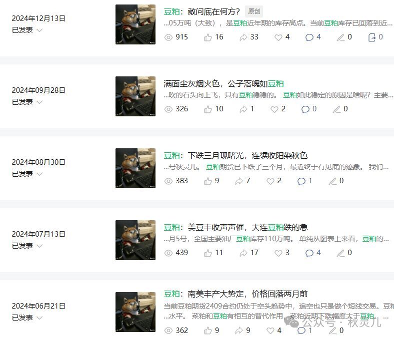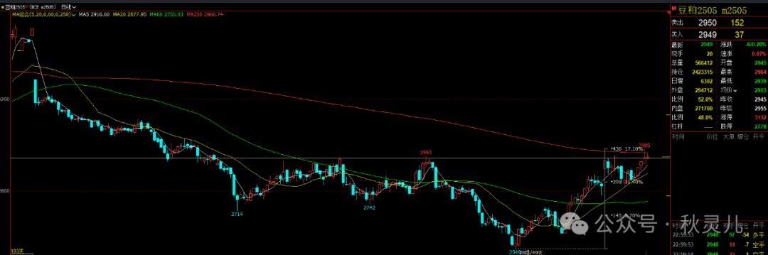 我去年下半年关于豆粕也写了很多。豆粕从2024年6月份之后,逐渐见顶,当前正在慢慢反弹。