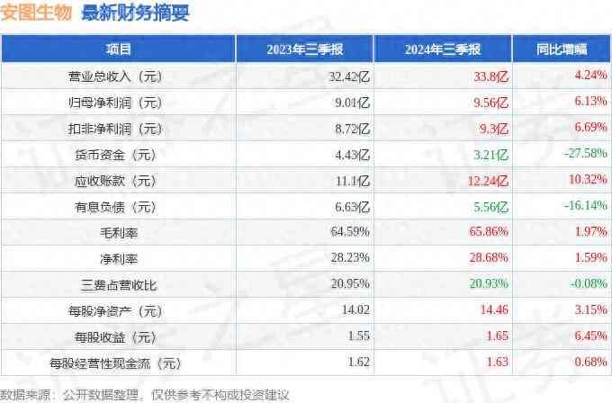 据证券之星公开数据整理,近期安图生物(603658)发布2024年三季报。截至本报告期末,公司营业总收入33.8亿元,同比上升4.24%,归母净利润9.56亿元,同比上升6.13%。按单季度数据看,第三季度营业总收入11.73亿元,同比上升3.38%,第三季度归母净利润3.37亿元,同比下降5.18%。本报告期安图生物公司应收账款体量较大,当期应收账款占最新年报归母净利润比达100.55%。