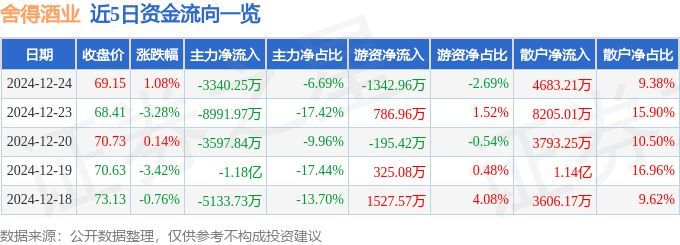 股票行情快报:舍得酒业(600702)12月24日主力资金净卖出3340.25万元