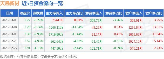 证券之星消息,截至2025年3月5日收盘,天晟新材(300169)报收于7.27元,下跌0.27%,换手率4.37%,成交量13.19万手,成交额9505.36万元。