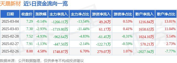 证券之星消息,截至2025年3月4日收盘,天晟新材(300169)报收于7.29元,下跌0.14%,换手率4.26%,成交量12.86万手,成交额9350.53万元。