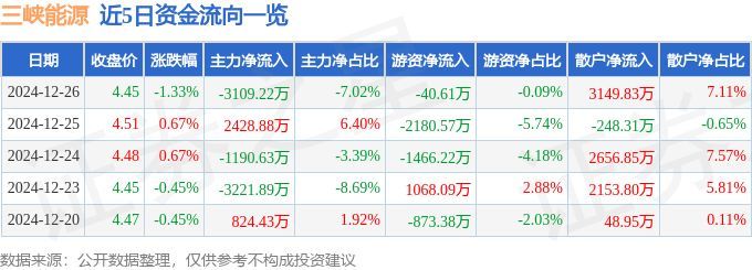 三峡能源(600905)12月26日主力资金净卖出3109.22万元