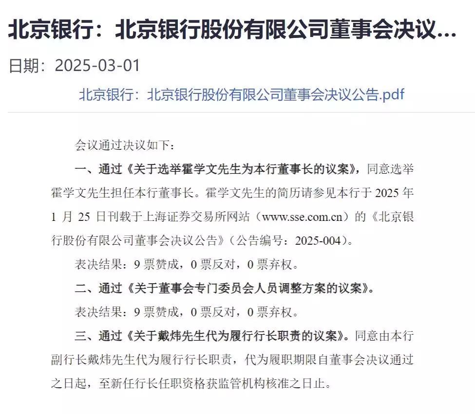 近日,北京银行发布公告称,董事会2025年第二次会议同意选举霍学文担任该行董事长,副行长戴炜代为履行行长职责,代为履行期限自董事会决议通过之日起,至新任行长任职资格获监管机构核准之日为止。