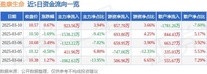 股票行情快报:盈康生命(300143)3月10日主力资金净买入923.56万元