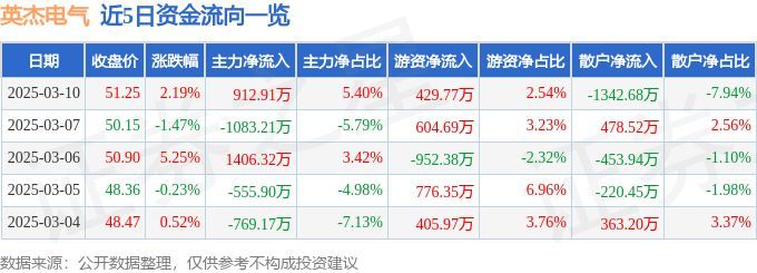 股票行情快报:英杰电气(300820)3月10日主力资金净买入912.91万元
