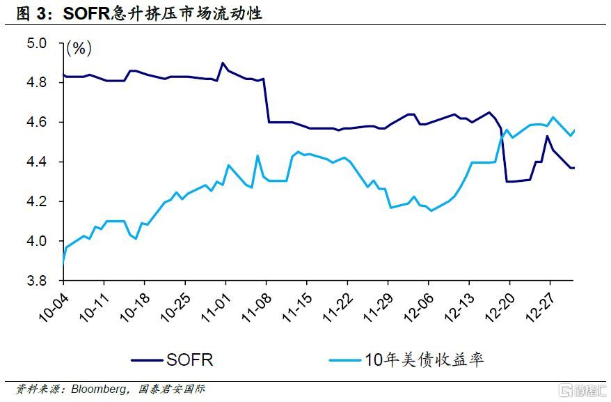 年末现金流需求放大了利率波动的影响,市场流动性吃紧。美联储12月议息会议中对于2025年降息次数的指引对市场而言无疑是重大打击,10年美债收益率向上一度攀升至超过4.64%,较12月初涨幅超过40个基点。美债是美国重要的短期有担保隔夜融资利率——SOFR的重要基准,美债收益率上升的时候(即抵押品贬值)意味着持有美债的机会成本和风险溢价的提高,于是融资成本随之增加,这进一步推高了SOFR水平。而年末市场流动性受企业资产负债表以及银行监管要求等因素影响本就趋紧,因此美债收益率的短期大幅拉升进一步扩大了市场流动性压力,SOFR在圣诞节前后飙升了超过23个基点。SOFR上升后,部分市场短线投资者,如对冲基金不得不被动平仓以调整持仓风险,从而对股市、黄金等资产价格造成一定冲击。