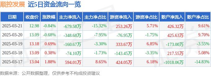 股票行情快报:顺控发展(003039)3月21日主力资金净卖出679.58万元