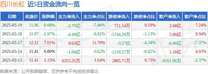 股票行情快报:四川长虹(600839)3月19日主力资金净卖出2.75亿元