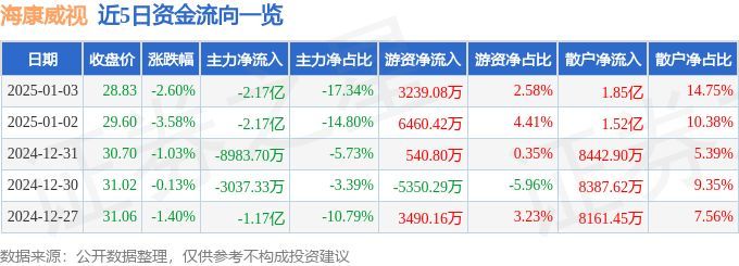 股票行情快报:海康威视(002415)1月3日主力资金净卖出2.17亿元