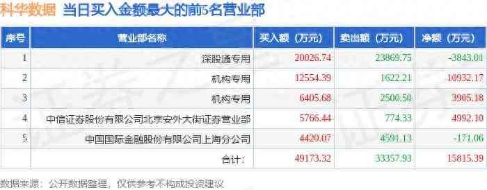 证券之星消息,沪深交易所2025年3月20日公布的交易公开信息显示,科华数据(002335)因日跌幅偏离值达到7%的前5只证券登上龙虎榜。此次是近5个交易日内第1次上榜。