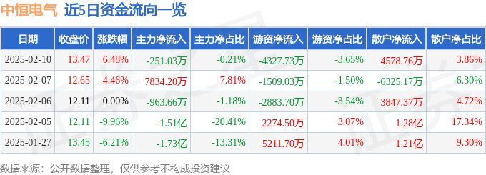 中恒电气(002364)2月10日主力资金净卖出251.03万元