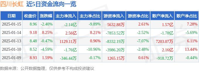 四川长虹(600839)1月15日主力资金净卖出2.14亿元