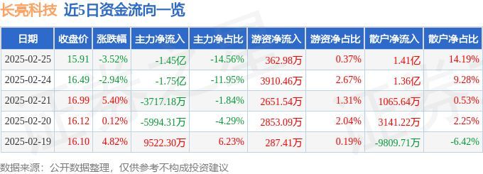 长亮科技(300348)2月25日主力资金净卖出1.45亿元
