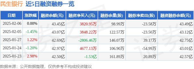 民生银行融资融券信息显示,融资方面,当日融资买入1.49亿元,融资偿还1.11亿元,融资净买入3820.95万元。融券方面,融券卖出10.09万股,融券偿还33.67万股,融券余量98.99万股,融券余额404.88万元。融资融券余额43.49亿元。