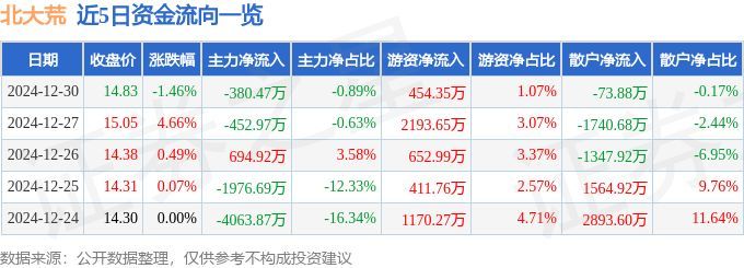 12月30日的资金流向数据方面,主力资金净流出380.47万元,占总成交额0.89%,游资资金净流入454.35万元,占总成交额1.07%,散户资金净流出73.88万元,占总成交额0.17%。