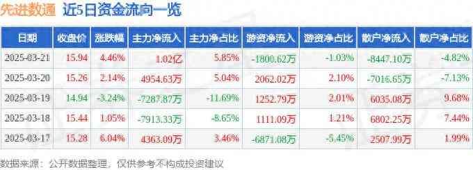先进数通(300541)3月21日主力资金净买入1.02亿元