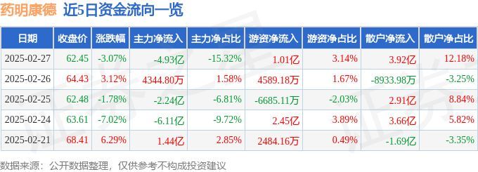 证券之星消息,截至2025年2月27日收盘,药明康德(603259)报收于62.45元,下跌3.07%,换手率2.04%,成交量51.14万手,成交额32.17亿元。