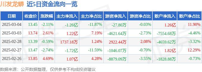 川发龙蟒(002312)3月4日主力资金净卖出1.26亿元
