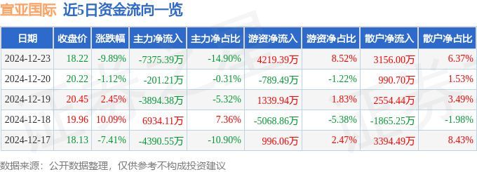 12月23日的资金流向数据方面,主力资金净流出7375.39万元,占总成交额14.9%,游资资金净流入4219.39万元,占总成交额8.52%,散户资金净流入3156.0万元,占总成交额6.37%。