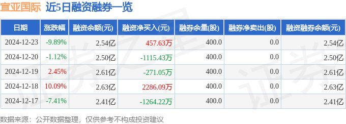宣亚国际融资融券信息显示,融资方面,当日融资买入5632.3万元,融资偿还5174.67万元,融资净买入457.63万元。融券方面,融券卖出0.0股,融券偿还0.0股,融券余量400.0股,融券余额0.73万元。融资融券余额2.54亿元。