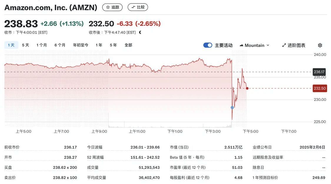 亚马逊第四季度营收和每股收益均超出预期,但云服务收入略低于预期,对于2025财年第一季度营收的展望也低于预期,拖累股价在盘后交易中下跌超2%。