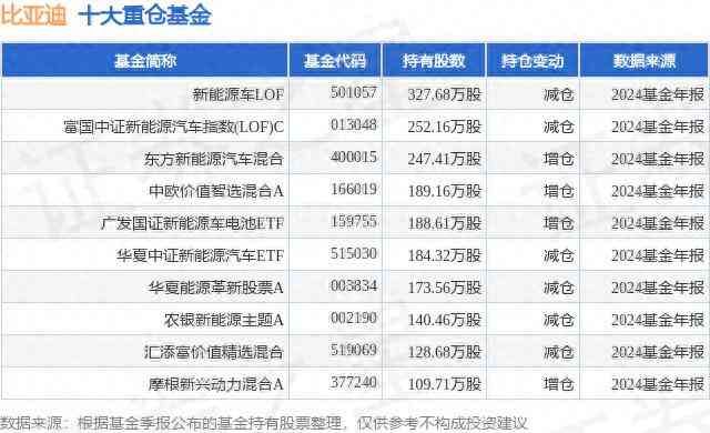 根据2024基金年报公募基金重仓股数据,重仓该股的公募基金共583家,其中持有数量最多的公募基金为汇添富基金的新能源车LOF。新能源车LOF目前规模为49.01亿元,最新净值1.8366(3月20日),较上一交易日下跌0.68%,近一年上涨16.07%。该公募基金现任基金经理为过蓓蓓。过蓓蓓在任的基金产品包括:汇添富中证主要消费ETF联接A,管理时间为2015年8月3日至今,期间收益率为122.8%;汇添富中证主要消费ETF,管理时间为2015年8月3日至今,期间收益率为125.88%;汇添富中证医药卫生ETF,管理时间为2015年8月3日至今,期间收益率为-18.08%;汇添富中证生物科技指数(LOF)A,管理时间为2016年12月22日至今,期间收益率为20.53%。
