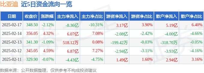 比亚迪(002594)2月17日主力资金净卖出8.36亿元