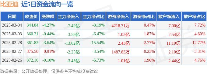 比亚迪(002594)3月4日主力资金净卖出7.42亿元