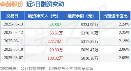 森赫股份:3月13日融资买入210.12万元,融资融券余额5324.9万元