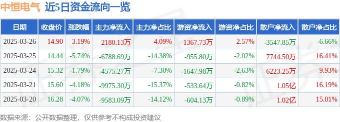 中恒电气(002364)3月26日主力资金净买入2180.13万元