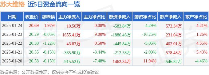 苏大维格(300331)1月24日主力资金净买入10.50万元