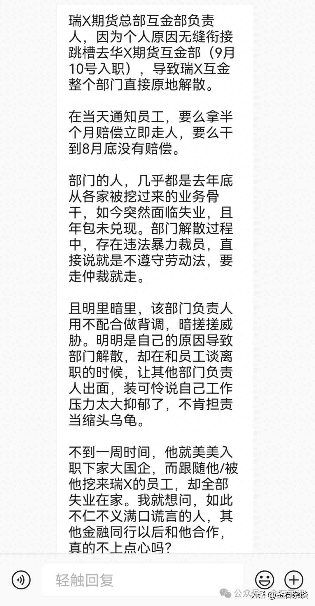 刚刚,据金石杂谈粉丝爆料,瑞X期货总部互金部负责人不讲武德,因为个人原因无缝衔接跳槽去华X期货互金部(9月10日入职),导致瑞X互金整个部门原地解散。