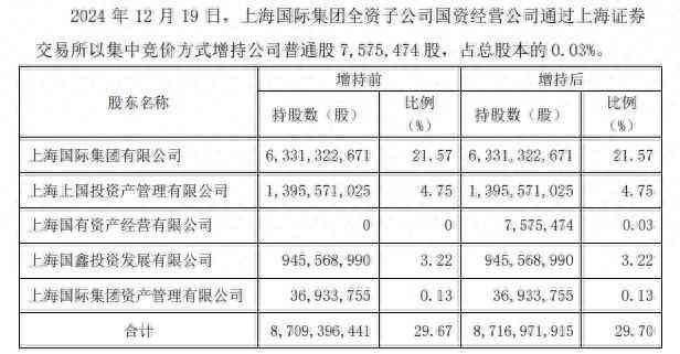 12月19日,浦发银行第一大股东上海国际集团有限公司(下称“上海国际集团”)通知,于12月19日通过全资子公司上海国有资产经营有限公司(下称“上海国资经营公司”)以集中竞价方式增持该行757.55万股股份,占总股本的0.03%。