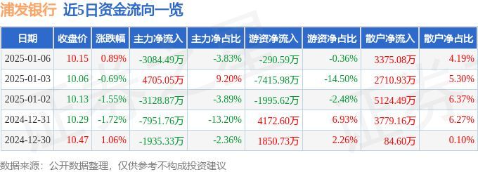 浦发银行(600000)1月6日主力资金净卖出3084.49万元