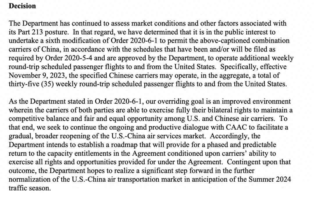 2023年8月11日,美国交通部宣布,自2023年9月1日起,允许中方航司每周执行最多18个中美往返直航客运航班。自2023年10月29日起,增加至每周24班。