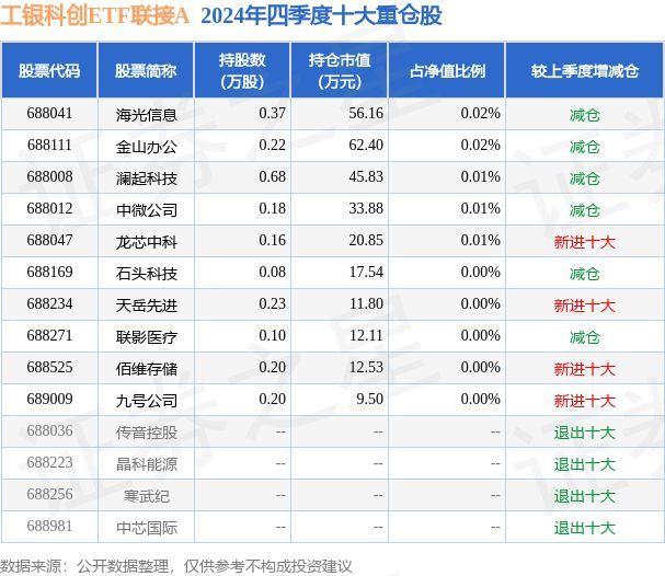 工银科创ETF联接A为指数型-股票基金,根据最新一期基金季报显示,该基金资产配置:股票占净值比0.12%,无债券类资产,现金占净值比5.95%。基金十大重仓股如下: