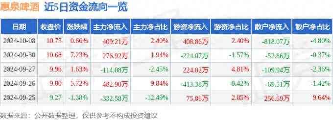 惠泉啤酒(600573)10月8日主力资金净买入409.21万元