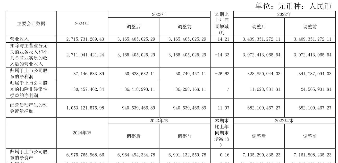 中证智能财讯 茂业商业(600828)3月27日披露2024年年度报告。2024年,公司实现营业总收入27.16亿元,同比下降14.21%;归母净利润3714.66万元,同比下降26.63%;扣非净利润亏损3045.75万元,上年同期亏损3641.9万元;经营活动产生的现金流量净额为10.53亿元,同比增长11.97%;报告期内,茂业商业基本每股收益为0.0214元,加权平均净资产收益率为0.53%。