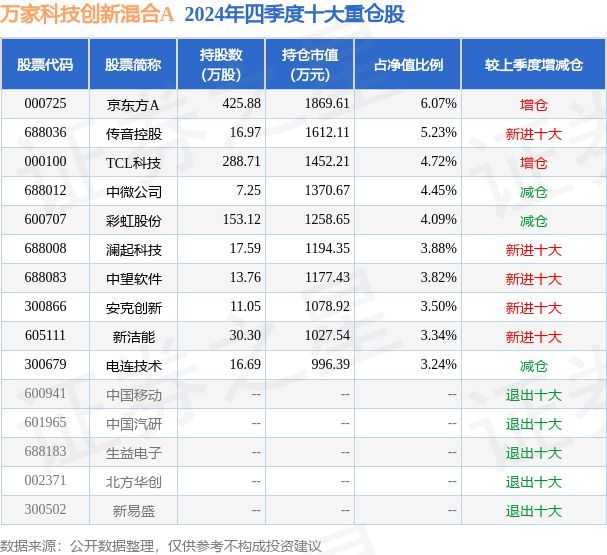万家科技创新混合A为混合型-偏股基金,根据最新一期基金季报显示,该基金资产配置:股票占净值比83.5%,债券占净值比1.22%,现金占净值比16.92%。基金十大重仓股如下: