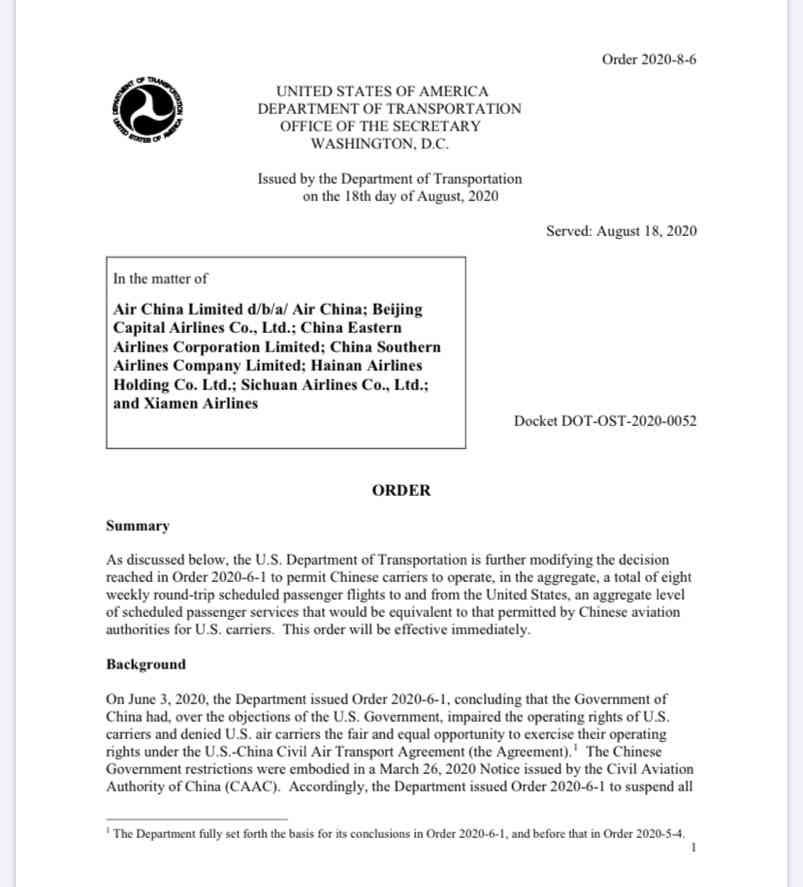 当地时间8月18日,美国交通部发布公告称,根据2020-8-6号命令的决定,允许中国航空公司将往返美国的定期客运航班增加至每周8班,与中国民航局最近允许美国承运人执飞的航班总数相对等,指令立即生效。