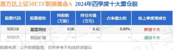 易方达上证50ETF联接基金A为指数型-股票基金,根据最新一期基金季报显示,该基金资产配置:无股票类资产,无债券类资产,现金占净值比5.56%。基金十大重仓股如下: