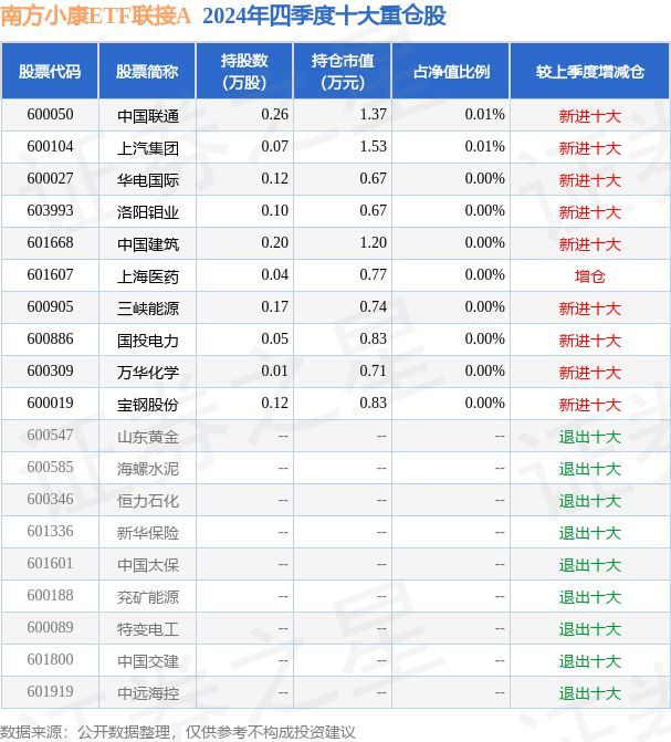 南方小康ETF联接A为指数型-股票基金,根据最新一期基金季报显示,该基金资产配置:股票占净值比0.15%,债券占净值比3.72%,现金占净值比1.67%。基金十大重仓股如下: