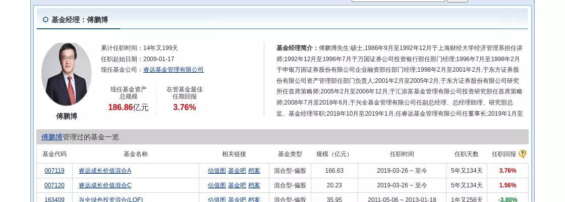 简历显示,傅鹏博先生:硕士,1986年9月至1992年12月于上海财经大学经济管理系担任讲师;1992年12月至1996年7月于万国证券公司投资银行部任部门经理;1996年7月至1998年2月于申银万国证券股份有限公司企业融资部任部门经理;1998年2月至2001年2月,于东方证券股份有限公司资产管理部任部门负责人;2001年2月至2005年2月,于东方证券股份有限公司研究所任首席策略师;2005年2月至2006年12月,于汇添富基金管理有限公司投资研究部任首席策略师;2008年7月至2018年6月,于兴全基金管理有限公司任副总经理、总经理助理、研究部总监、基金经理等职;2018年10月至2019年1月,任睿远基金管理有限公司任董事长;2019年1月至今,任睿远基金管理有限公司副总经理。