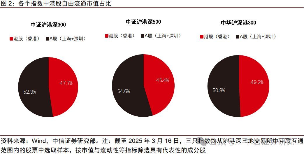 ▍从主要涵盖沪港深三地市场的指数看,港股占比均超过40%。